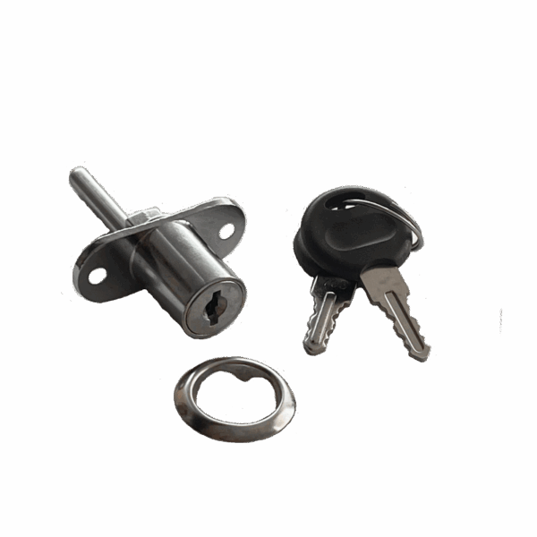 Cerradura de seguridad tipo Pin Trampa de 16 mm de diámetro, ideal para cajones, vitrinas y módulos que requieren un sistema de bloqueo interno oculto. Su diseño compacto ofrece una solución segura y discreta, dificultando la apertura forzada desde el exterior.
