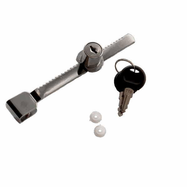 Cerradura diseñada especialmente para vitrinas y muebles con puertas corredizas de vidrio o acrílico. Su cuerpo delgado de 140 mm permite una instalación discreta, manteniendo la estética del mueble y brindando seguridad y control de acceso en espacios comerciales o residenciales.