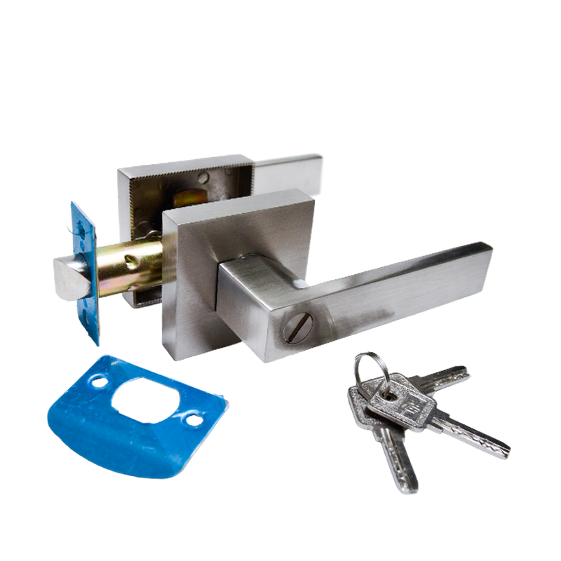 Chapa manija con placa cuadrada y acabado satinado, diseñada para puertas de alcoba o interiores...