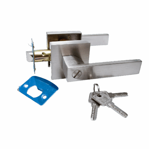 Chapa manija con placa cuadrada y acabado satinado, diseñada para puertas de Entrada Principal o exteriores residenciales. Combina diseño moderno y funcionalidad, ofreciendo privacidad con un mecanismo de cierre suave y seguro. Ideal para proyectos de carpintería de gama media y alta.